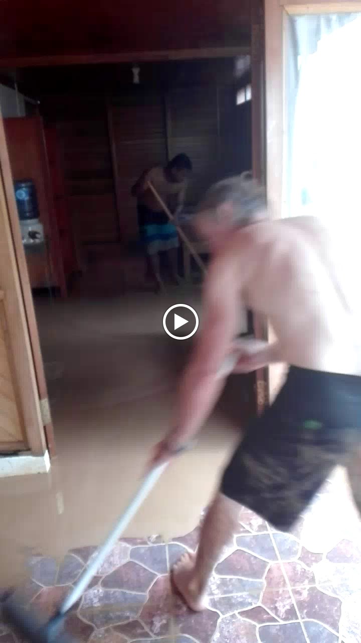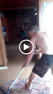 Na 8 dagen duiken was het 's nachts erg hard beginnen te regenen. Tijdens het ontbijt begonnen er links en rechts van het restaurant beekjes te vormen. Beekjes die altijd maar groter werden en tot modderstromen werden herleid. Wij dachten in het begin dat dat daar wel vaker voorkwam maar toen het personeel de stromen begon te filmen wisten we dat het niet normaal was. Mimi, onze Koreaanse buurvrouw haar kamer begon als eerste onder water-modder te staan. We hebben nog een half uur geprobeerd het uit onze kamer te houden, door met alle geweld af te trekken, maar tegen zo'n natuurgeweld is zelfs Stef niet bestand. Gelukkig had ik net alle bagage van de grond op het bed geplaatst zodat onze spullen niet onder de modder zaten. Ook de receptie en het centrale bargedeelte zat onder een dikke laag modder, water en electriciteit was er niet meer.